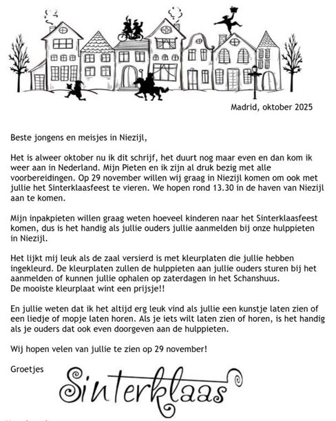Sinterklaas Uitgelicht Sinterklaas intocht Niezijl – 2025 Dorpsbelangen Niezijl 6 november, 2025 0 Bericht navigatie Vorige: Dorpsproat november 2025 Gerelateerd Dorpsproat Uitgelicht Dorpsproat november 2025 Iwan 2 november, 2025 0 Laatste Nieuws Nieuws Uitgelicht Verkiezingen Uitslag Verkiezingen 2de Kamer – Stembureau Niezijl Iwan 29 oktober, 2025 0 Dorpsproat Uitgelicht Dorpsproat oktober 2025 Iwan 19 oktober, 2025 0 Geef een reactie Reactie annulerenJe e-mailadres wordt niet gepubliceerd. Vereiste velden zijn gemarkeerd met *Reactie * Naam * E-mail * Site Mijn naam, e-mail en site opslaan in deze browser voor de volgende keer wanneer ik een reactie plaats.